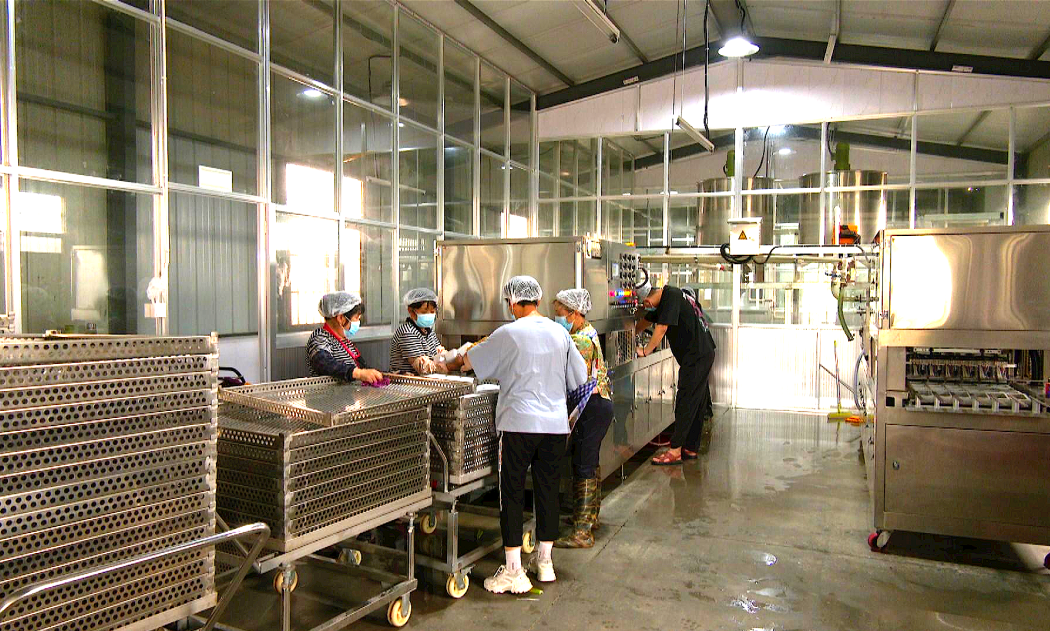 夏港村通過(guò)引進(jìn)種植大戶,成立農(nóng)民專業(yè)合作社,以“訂單農(nóng)業(yè)”推進(jìn)特色種植產(chǎn)業(yè)化發(fā)展。一年種兩茬,一茬畝產(chǎn)能達(dá)2500斤,市場(chǎng)價(jià)格可達(dá)4元一斤。優(yōu)質(zhì)的毛豆主要銷往浙江、上海等地,深受客戶喜愛。小小的毛豆,正成為當(dāng)?shù)卮迕裨鍪罩赂坏?ldquo;金豆”。 多措并舉,新型農(nóng)村集體經(jīng)濟(jì)蓬勃發(fā)展 近年來(lái),泰興市堅(jiān)持走新型農(nóng)村集體經(jīng)濟(jì)發(fā)展之路,加快構(gòu)建產(chǎn)權(quán)關(guān)系明晰、經(jīng)營(yíng)方式穩(wěn)健、權(quán)能結(jié)構(gòu)完整的運(yùn)行新機(jī)制。以村集體為基本單位,將集體經(jīng)濟(jì)和民營(yíng)經(jīng)濟(jì)有機(jī)結(jié)合,激發(fā)農(nóng)村各類經(jīng)濟(jì)組織創(chuàng)造新產(chǎn)業(yè)、新業(yè)態(tài)、新模式。 分界鎮(zhèn)滕興村經(jīng)過(guò)市場(chǎng)調(diào)研,與泰興市鵬程禽蛋專業(yè)合作社深度合作,建設(shè)了占地5畝的標(biāo)準(zhǔn)廠房,引進(jìn)了一條配套的鴨血鴨雜加工生產(chǎn)線,打通了禽類副產(chǎn)品加工渠道。這一舉措不僅為企業(yè)帶來(lái)了可觀的收益,也為村集體帶來(lái)了穩(wěn)定的增收。據(jù)滕興村黨總支書記、村委會(huì)主任楊俊健介紹,企業(yè)每年上繳4萬(wàn)元的標(biāo)房租金給村里,并按照企業(yè)利潤(rùn)的5%上繳給村集體,使得村級(jí)增收達(dá)到5.5萬(wàn)元。