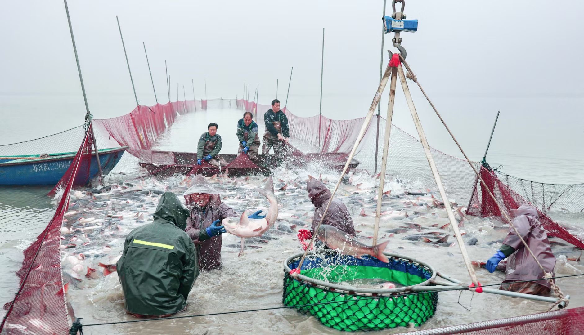 沙溝水產(chǎn)品交易市場是江蘇省最大的淡水產(chǎn)品原產(chǎn)地批發(fā)市場,輻射周邊地區(qū)10多個鄉(xiāng)鎮(zhèn),帶動面積近100萬畝,水產(chǎn)品銷往全國各地,并遠銷韓國、俄羅斯等國。當?shù)氐?ldquo;一條魚”,不僅富了養(yǎng)殖業(yè),興了加工業(yè),也帶動了旅游業(yè)發(fā)展,為興化打造新時代“魚米之鄉(xiāng)”添了一筆亮彩。 “智”上引領,養(yǎng)殖業(yè)轉型升級 “如果不是今天捕魚,現(xiàn)在投餌根本不出家門,直接手機操作,還可以看到魚塘的實時畫面。”養(yǎng)殖戶王金友說。 作為有著30多年經(jīng)驗的養(yǎng)魚戶,以前最讓王金友頭疼的就是喂魚。一袋袋菜籽餅搬到船上,用鐵鍬拌勻,一鍬鍬撒到水塘,每天成百上千斤的魚食,“哪怕是冬季,一到喂魚時那汗出的,衣服就沒有干過。”