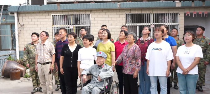 國(guó)慶節(jié)當(dāng)日,泰州各地干部群眾同升一面旗、同唱一首歌,共同慶祝中華人民共和國(guó)成立75周年。 上午9時(shí),在姜堰區(qū)蔣垛鎮(zhèn),110歲吳九成身著紅軍服,坐著輪椅來(lái)到自家庭院里,參加升國(guó)旗儀式。雖然老人已不能站立,但他依然堅(jiān)持完成了這場(chǎng)跨越百年的紅色精神傳承。 吳九成女婿金克義說(shuō):“升國(guó)旗現(xiàn)在已經(jīng)成為我們家一個(gè)傳統(tǒng)了,每年的10月1日都要有這個(gè)儀式,把愛(ài)國(guó)精神永遠(yuǎn)傳承下去,一代一代都不要忘記。”
