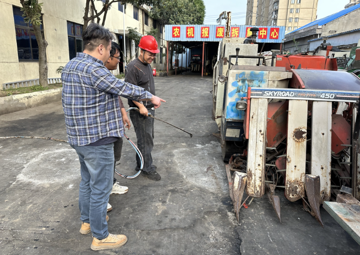 近日,在泰興市匯豐農(nóng)機(jī)有限公司廢舊農(nóng)機(jī)回收拆解點,拆解機(jī)、電焊機(jī)、叉車機(jī)械輪番運作,工作人員正對廢舊農(nóng)機(jī)進(jìn)行拆解作業(yè)。種糧大戶李星于2020年購買了一臺中小型水稻收割設(shè)備,經(jīng)長時間連續(xù)作業(yè),多個零件磨損嚴(yán)重,存在較大安全隱患,也達(dá)到了強(qiáng)制報廢年限。“以前只好賣廢鐵,才3800多元,現(xiàn)在國家有農(nóng)機(jī)報廢更新補(bǔ)貼政策,可以補(bǔ)貼17500元,同時我今天購買了新的收割機(jī),還多補(bǔ)貼8000元,購買的新機(jī)還享受農(nóng)機(jī)購置補(bǔ)貼27000元,非常劃算!”李星開心地說。