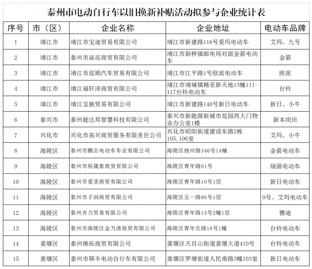 泰州:電動(dòng)自行車(chē)以舊換新補(bǔ)貼標(biāo)準(zhǔn)公布