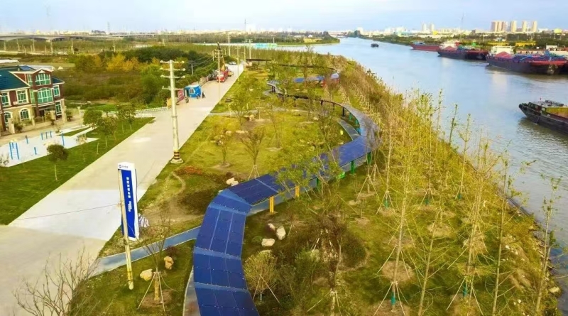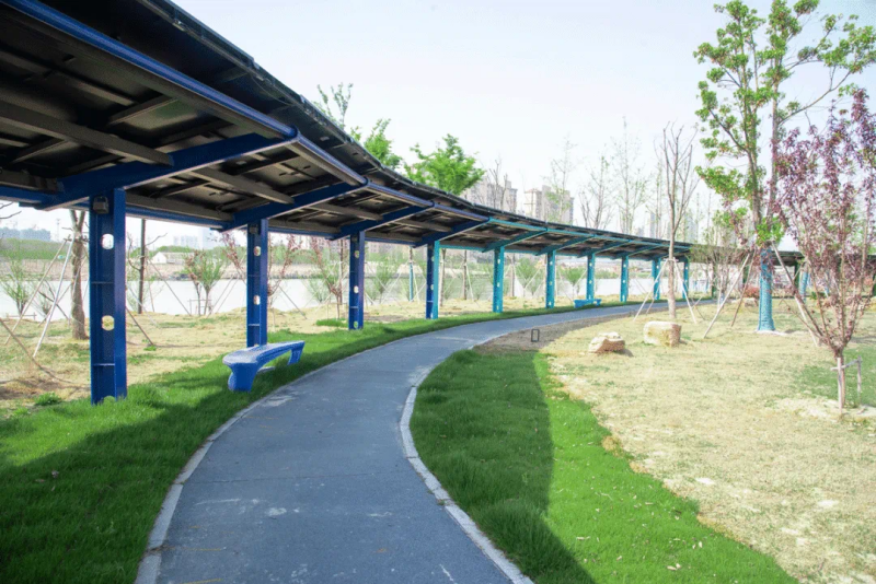 初冬時(shí)節(jié),在泰州市海陵區(qū)北郊,暖陽(yáng)下的新通揚(yáng)運(yùn)河水面波光粼粼,河畔綠草如茵,碳中和林內(nèi)草木蔥蘢,一條條健康跑道蜿蜒其中,數(shù)百米長(zhǎng)的彩虹光伏長(zhǎng)廊筆走龍蛇,繪就了一幅運(yùn)河、綠地、民居和諧共存的美麗畫卷。這片生機(jī)盎然的綠地有一個(gè)頗為詩(shī)意的名字——百舸生態(tài)園。