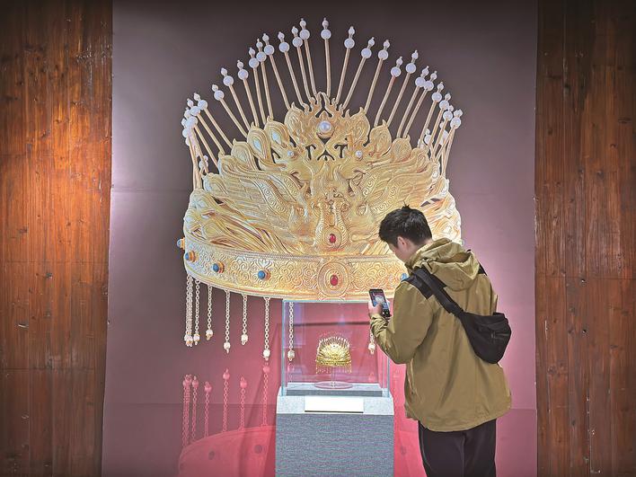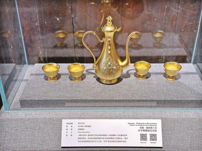▲觀眾欣賞《梅韻華冠》,不禁拿起手機(jī)拍攝。 本次展覽以現(xiàn)代服飾為載體,將傳統(tǒng)金屬工藝與現(xiàn)代設(shè)計(jì)理念相融合,共展出12套別具匠心的藝術(shù)精品,包括鳳冠、酒具、刀劍、茶具、花器、項(xiàng)鏈、云肩、耳飾等門類,付少雄用作品闡釋了他對(duì)京劇藝術(shù)的理解和對(duì)梅蘭芳大師的景仰。 步入展廳,首先映入眼簾的是一個(gè)金燦燦的鳳冠。鳳凰羽翼層疊流動(dòng),彰顯出高貴典雅的氣質(zhì),中部龍鳳相融的造型,仿佛在訴說著舞臺(tái)上的陰陽調(diào)和、剛?cè)岵?jì)。據(jù)介紹,這套鳳冠造型作品名為《梅韻華冠》,寓意“梅派”京劇之美輝耀千秋,這是付少雄致敬梅蘭芳先生藝術(shù)精神的代表作,備受觀眾喜愛。旁邊銀鍍金酒具造型的作品名為《醉月芳華》,是以梅蘭芳先生的經(jīng)典劇目《貴妃醉酒》為靈感設(shè)計(jì),將京劇的典雅古韻與傳統(tǒng)的鍛造工藝巧妙結(jié)合。其中,“醉月”取自貴妃的情感之醉與月下之美,“芳華”象征京劇藝術(shù)的繁華永續(xù)!对菩滹L(fēng)華》以梅蘭芳京劇服飾為靈感,在云肩中融入了細(xì)膩的刺繡工藝,每一針每一線都透著靈動(dòng)與韻律,呈現(xiàn)出京劇服飾的優(yōu)雅與華貴。