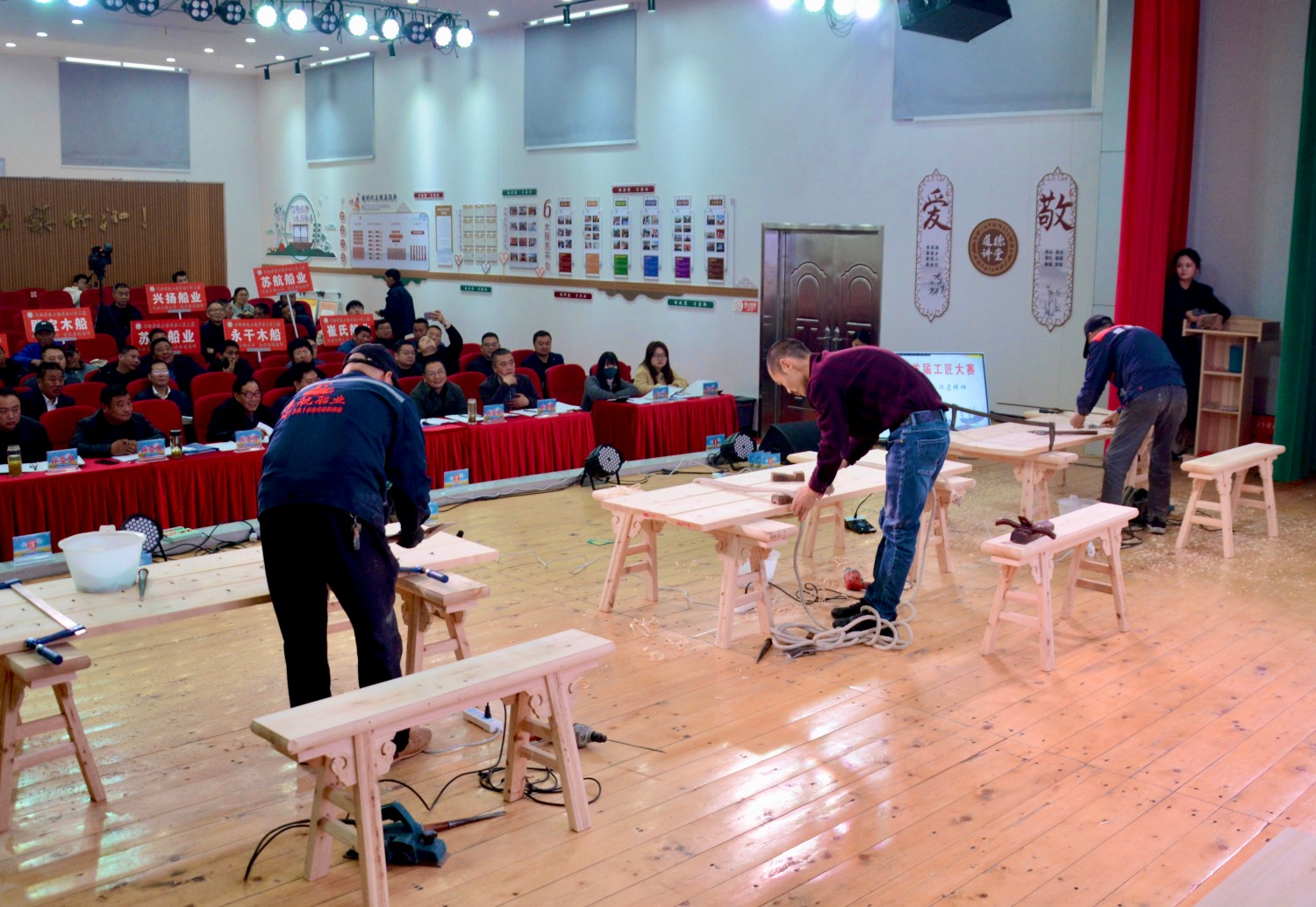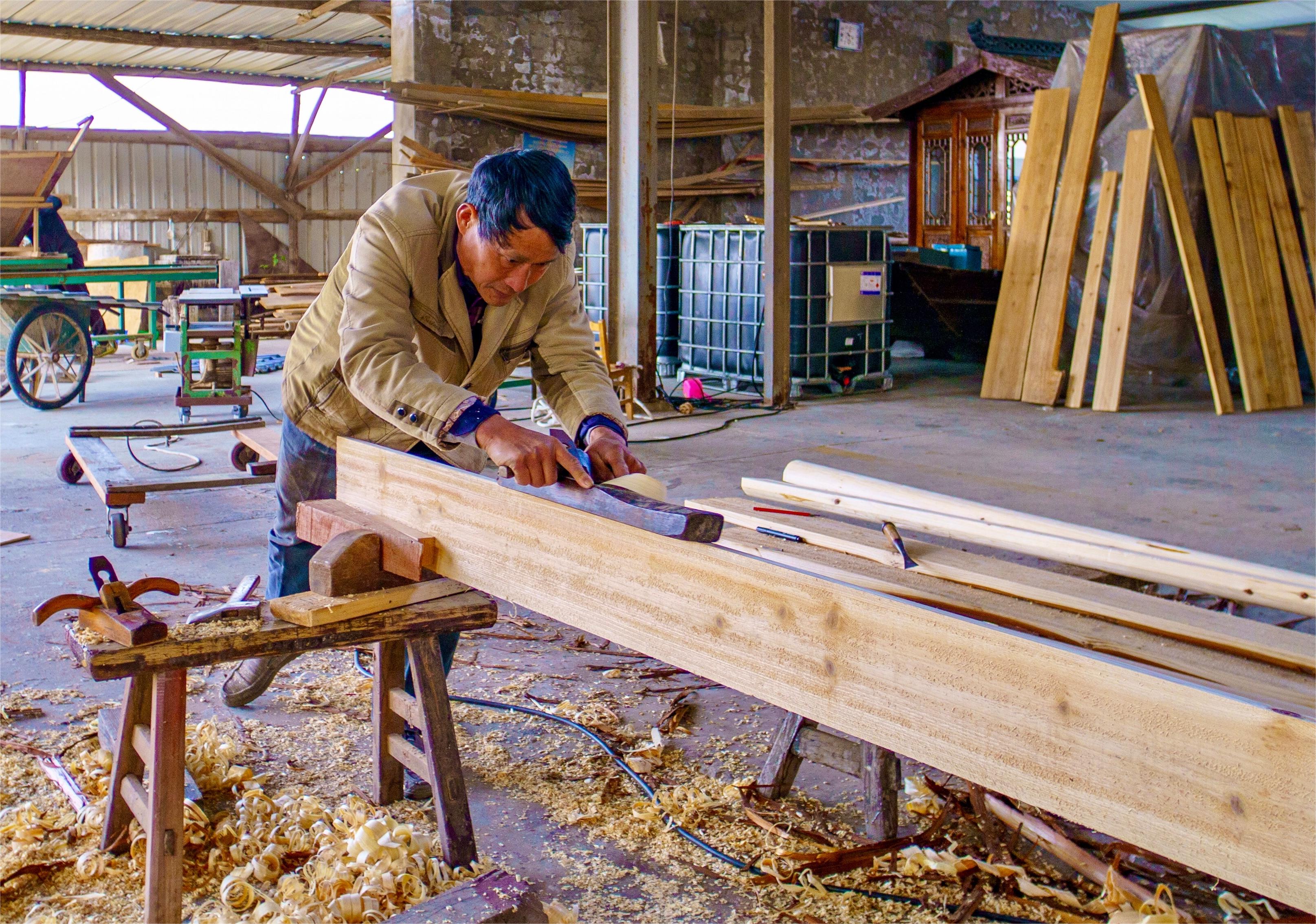 除了激動(dòng)人心的現(xiàn)場(chǎng)比拼,竹泓工匠們的故事也同樣精彩。此次比賽選手中,年齡最長(zhǎng)的是74歲的老工匠王金明,最年輕的是30歲的傳承人周建鑫,他們?cè)诒荣愔谢ハ鄬W(xué)習(xí),互相借鑒,讓此次大賽不僅成為一次技藝的比拼,更是一次文化的傳承。周氏四兄弟同臺(tái)競(jìng)技,每一次敲擊、每一次雕琢,都凝聚著他們對(duì)木船制造技藝的熱愛,他們希望通過自己的努力,讓更多的人了解和關(guān)注竹泓傳統(tǒng)木船制造技藝,讓這項(xiàng)古老的手藝得以延續(xù)和發(fā)揚(yáng)光大。 賦能升級(jí) 共繪新篇 發(fā)展非遺產(chǎn)業(yè)是對(duì)非遺進(jìn)行生產(chǎn)性保護(hù)的重要手段。最高峰時(shí),一個(gè)小鎮(zhèn)集聚了近百家造船作坊。然而進(jìn)入新世紀(jì),由于公路交通的快速發(fā)展以及水泥船的競(jìng)爭(zhēng)等多重因素,竹泓木船風(fēng)光不再、訂單銳減,作坊萎縮到十余家。如何讓這一傳統(tǒng)技藝度過生存危機(jī),興化市認(rèn)真分析,針對(duì)企業(yè)小、利潤(rùn)薄等問題,給出破題關(guān)鍵,那就是組團(tuán)走產(chǎn)業(yè)化之路。2012年,興化竹泓鎮(zhèn)建成木船文化產(chǎn)業(yè)園。