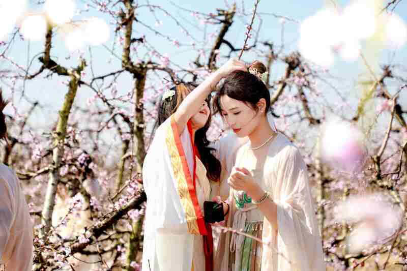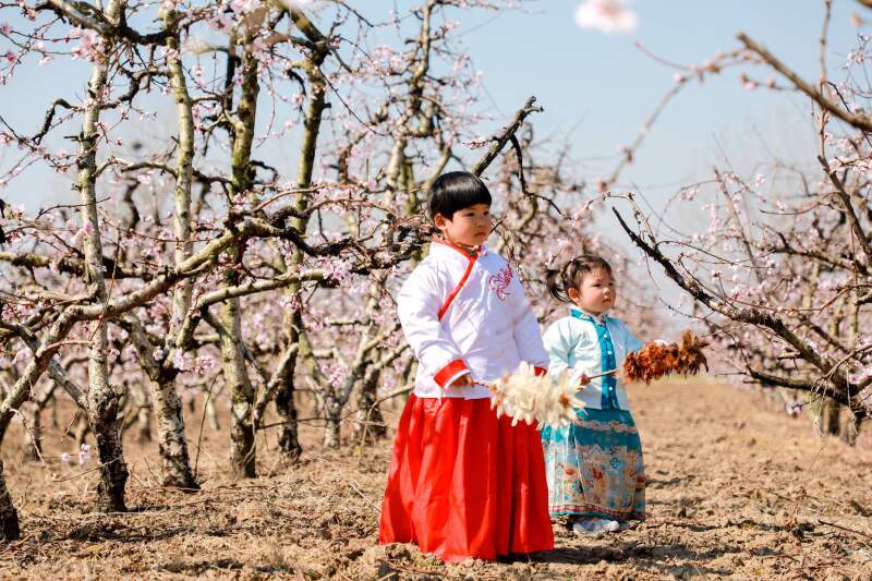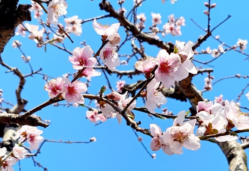 桃園里朵朵桃花陸續(xù)綻放,或正、或側(cè)、或仰、或俯,紅白相間,婀娜多姿。枝頭有一些慵懶的,仍含苞待放,猶如美人額間胭脂色的花鈿。放眼望去,桃樹綿延,桃花爛漫,美不勝收。游客們穿梭于桃林之間,紛紛舉起手機,記錄下這美好時刻。