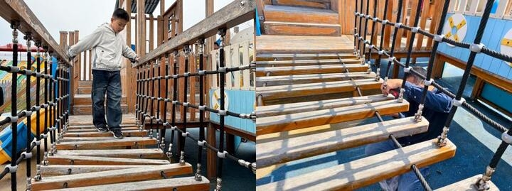 此前報(bào)道中提到的柳園老年體育公園,是2021年泰州市體育為民突破行動(dòng)市屬健身設(shè)施項(xiàng)目。有市民反映該體育公園內(nèi)投入使用三四年的健身器材,有些已經(jīng)銹跡斑斑,有的“缺胳膊少腿”,有的則成了無法使用的“鐵疙瘩”。“適老訓(xùn)練器材相對(duì)好一點(diǎn),兒童健身區(qū)域的秋千還能用,但上面連接的鐵鏈卻銹得厲害,沙袋也沒了蹤影。”市民掃描附近張貼的“活力泰州”二維碼,已經(jīng)可以進(jìn)入“我要報(bào)修”頁(yè)面,但沒有關(guān)于兒童健身器材的選項(xiàng)。由泰州文旅物業(yè)管理公司豎立的告示牌上,“愛護(hù)公共健身器材 故意損壞照價(jià)賠償”的使用提示醒目可見,卻不見報(bào)修電話和監(jiān)督電話等信息。 而在三河體育公園兒童設(shè)施區(qū)域,此前報(bào)道提及的一座木質(zhì)吊橋一側(cè)牽引繩索脫落、網(wǎng)繩秋千接口處零部件缺失等情況,相關(guān)責(zé)任單位第一時(shí)間安排維修人員,通過緊固螺絲、更換零部件等,目前已維修到位,油漆剝落的也同步出新。
