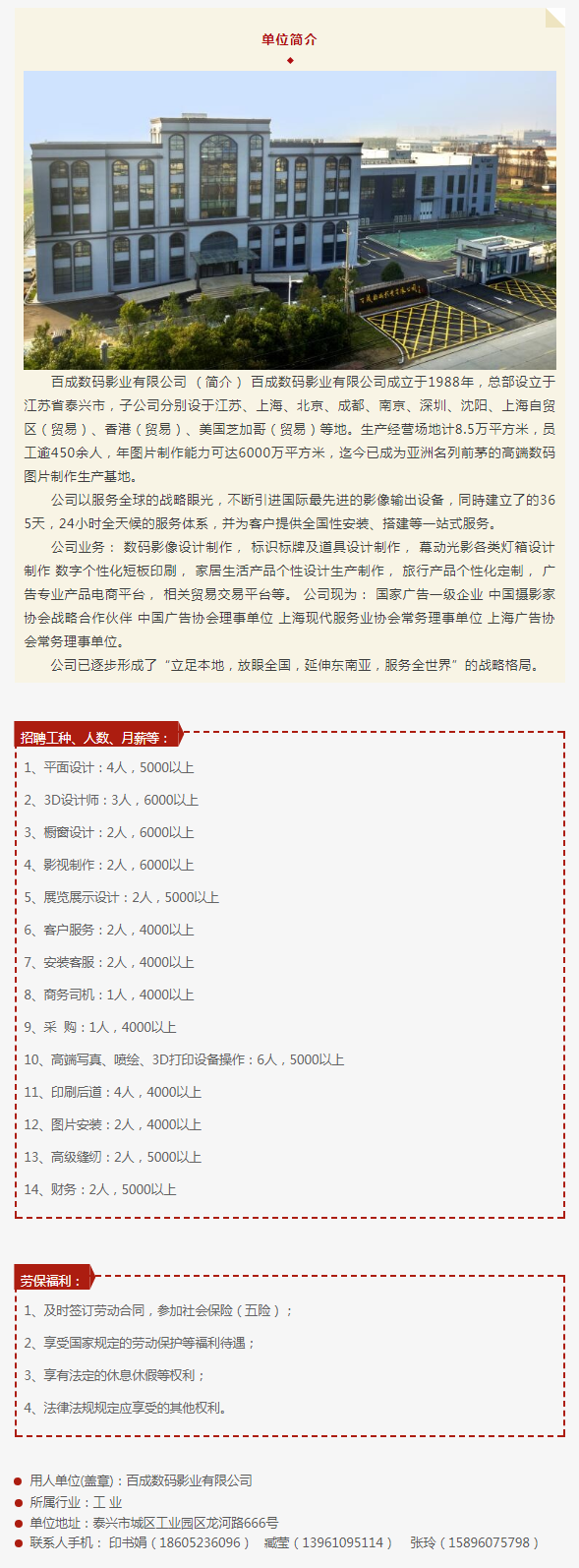百成數(shù)碼影業(yè)有限公司、江蘇博門(mén)藝嘉網(wǎng)絡(luò)技術(shù)有限公司、意飄達(dá)傳媒科技有限公司2019招聘簡(jiǎn)章