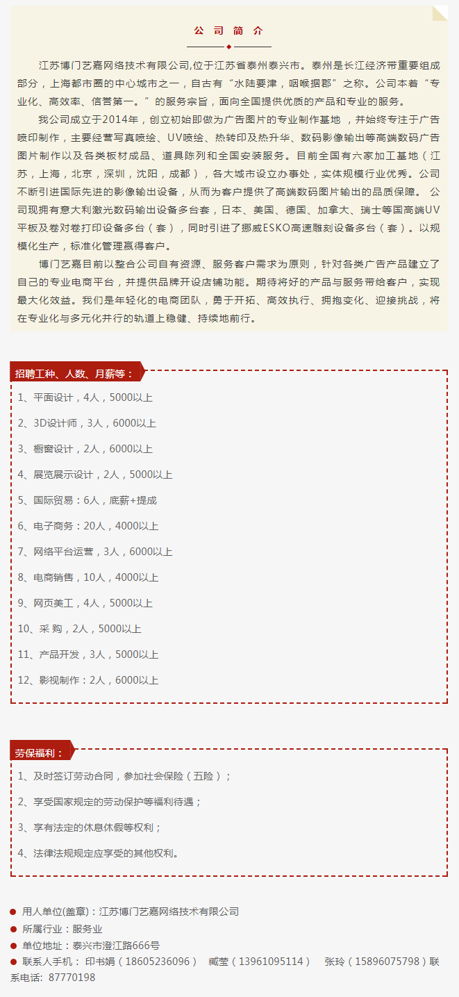 江蘇博門藝嘉網(wǎng)絡(luò)技術(shù)有限公司2019招聘簡章