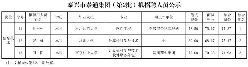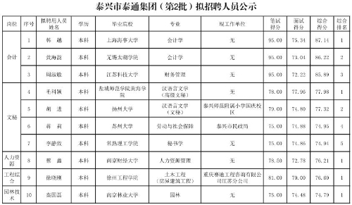泰興市泰通集團(第2批)擬招聘人員公示表