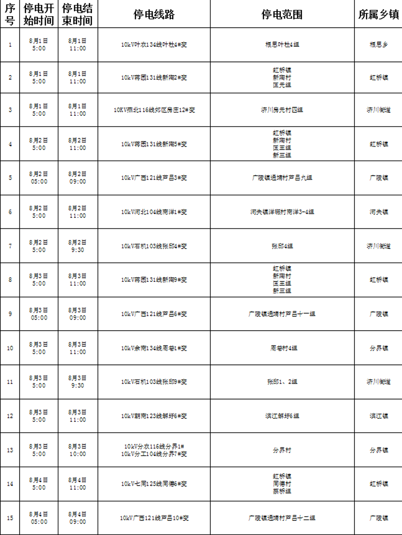 泰興市供電公司停電公告(2019年8月1日-2019年8月4日)