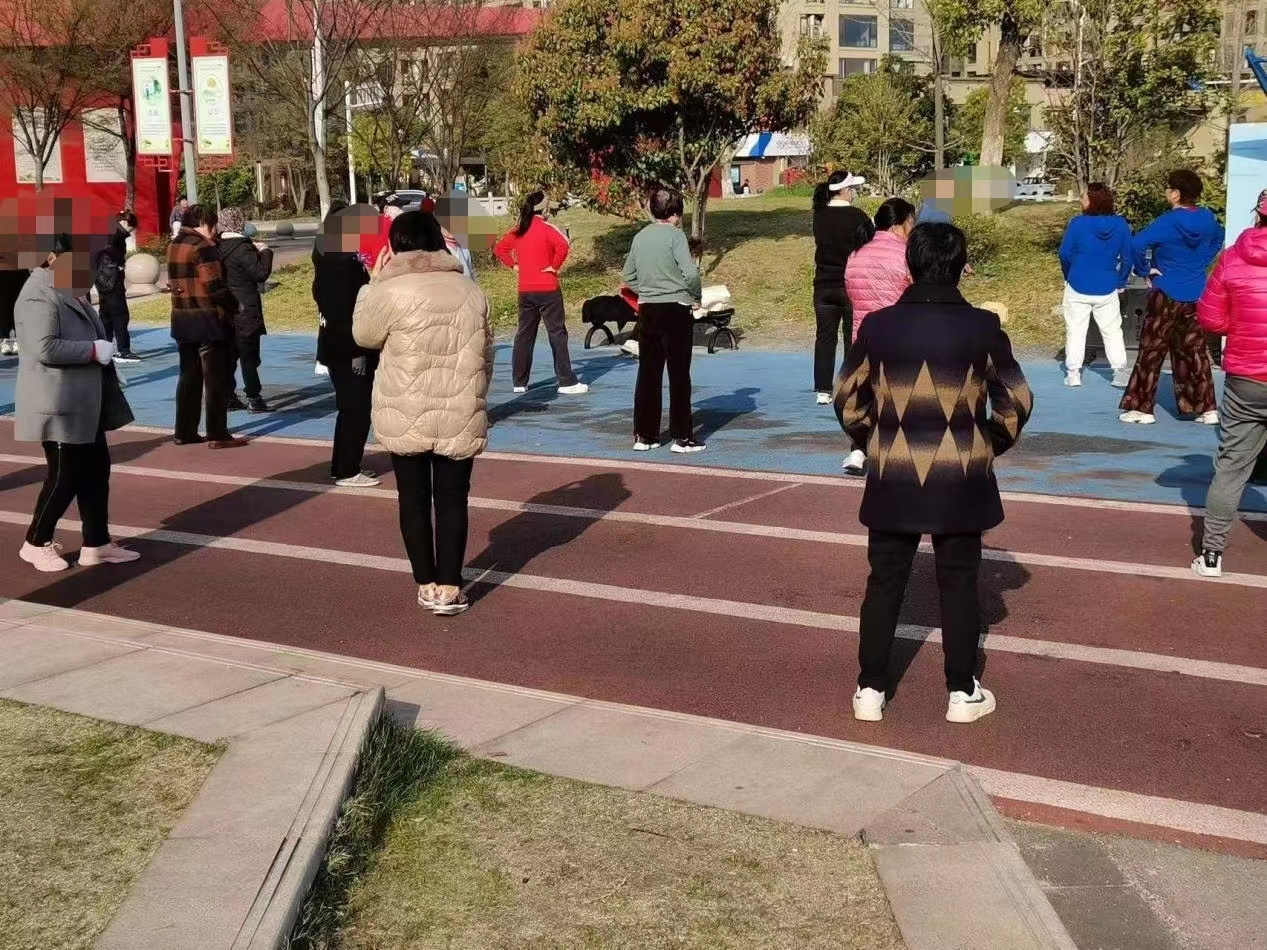 公共場所躺臥 在某城市公園,晨練的群眾占用人行道,對旁邊“文明游園須知”的警示牌視而不見。