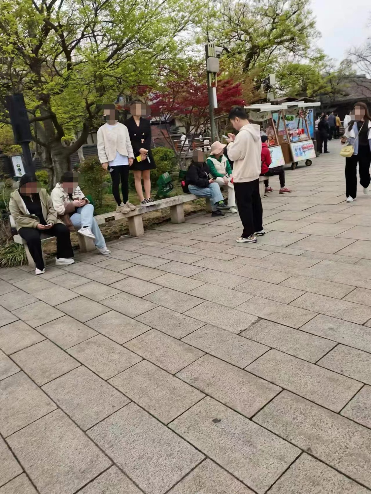 游客站在石凳上