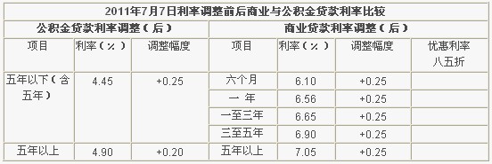 2011年7月7日利率調(diào)整前后商業(yè)與公積金貸款利率比較