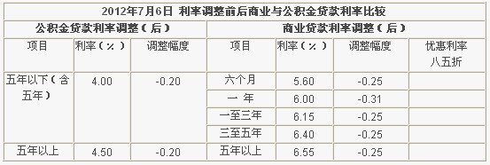 2012年7月6日利率調(diào)整前后商業(yè)與公積金貸款利率比較