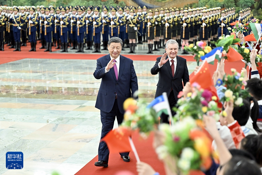 1月24日下午,國家主席習(xí)近平在北京人民大會堂同來華進(jìn)行國事訪問的烏茲別克斯坦總統(tǒng)米爾濟(jì)約耶夫舉行會談。這是會談前,習(xí)近平在人民大會堂北大廳為米爾濟(jì)約耶夫舉行歡迎儀式。新華社記者 殷博古 攝