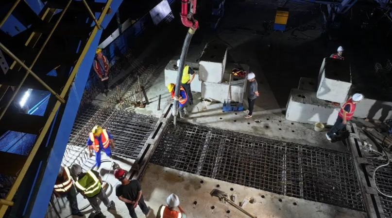7月15日,由中鐵十一局承建的滬渝蓉高鐵(北沿江高鐵)泰興段內,第一座連續(xù)梁完成合龍。23點18分,隨著一陣喜慶的煙花爆竹聲響起,滬渝蓉高鐵通泰揚特大橋跨規(guī)劃S504連續(xù)梁開始合龍。施工現場,數十名工人各司其職,緊密配合。在施工人員的精準操控下,攪拌好的混凝土源源不斷地被注入施工處,F場技術負責人告訴小編,之所以選在夜間11點多進行施工,主要是出于對施工要求的考慮。連續(xù)梁合龍段澆筑,需要在一天中溫度最低時施工,以保證施工的質量和效率。