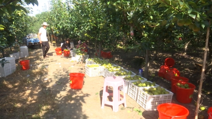 走進(jìn)王坔村味之源蜜梨種植基地,空氣中彌漫著清甜的氣息,枝繁葉茂的梨樹上,一個(gè)個(gè)碩大的梨子掛滿枝頭,分外誘人。工人們正忙著采摘、搬運(yùn),現(xiàn)場一派喜人的豐收景象。