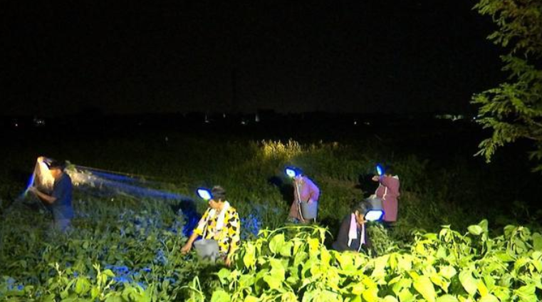 連日來(lái),泰興市黃橋鎮(zhèn)嚴(yán)徐村試驗(yàn)養(yǎng)殖的豆丹陸續(xù)上市,這種外表形似毛毛蟲(chóng)的小東西,不僅是營(yíng)養(yǎng)豐富的餐桌美食,而且效益可觀(guān),為嚴(yán)徐村趟出一條增收新路子。 夏日夜晚的嚴(yán)徐村,微風(fēng)伴隨著陣陣豆香,枝繁葉茂的黃豆一棵棵緊挨著,田頭眺望,陣陣藍(lán)光或隱或現(xiàn),20多個(gè)村民頭戴熒光燈穿梭在植株之間,嫻熟地采摘著柔嫩飽滿(mǎn)的豆丹。