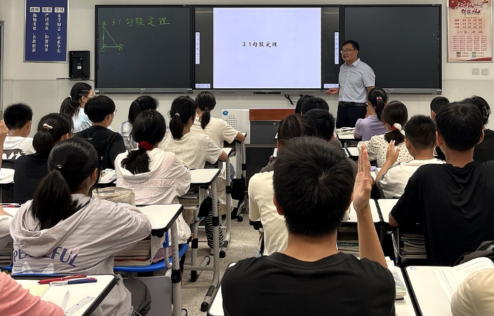 10月9日上午,在泰興市實(shí)驗(yàn)初中教育集團(tuán)文江分校,有著30多年教齡的管旺進(jìn)正用智慧屏給孩子們上數(shù)學(xué)課,曾經(jīng)復(fù)雜的數(shù)學(xué)定理如今能在屏幕上直觀呈現(xiàn)推導(dǎo)過程。“過去教學(xué)主要依靠黑板、粉筆,無其他技術(shù)支持。如今,現(xiàn)代技術(shù)構(gòu)建多元空間,沉浸式、體驗(yàn)式、真實(shí)性的場(chǎng)景讓學(xué)生接受知識(shí)更鮮活,學(xué)習(xí)活動(dòng)可視化也使教學(xué)更生動(dòng)直觀。”泰興市實(shí)驗(yàn)初中教育集團(tuán)文江分校副校長(zhǎng)管旺進(jìn)感慨道。