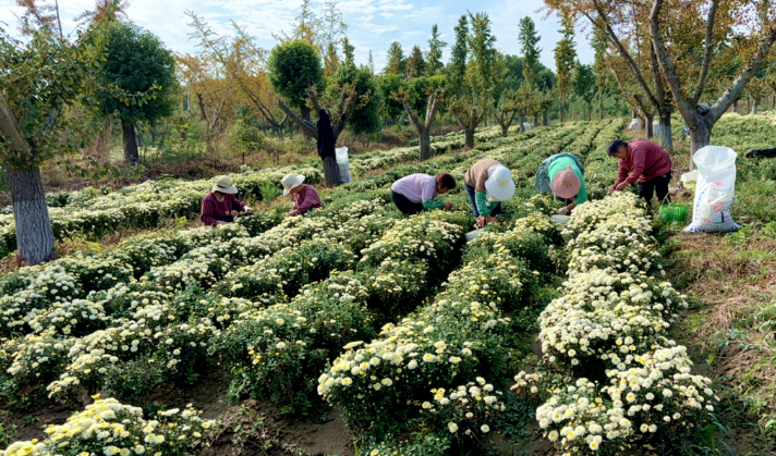 菊花種植產業(yè)是老葉村發(fā)展的“一村一品”特色產業(yè)。近年來,該村積極盤活土地資源,采取“黨支部+合作社+基地+農戶”的發(fā)展模式,大力發(fā)展菊花種植產業(yè),帶動了100余名村民在家門口利用十邊隙地,穩(wěn)定就業(yè)增收。菊花產業(yè)基地負責人肖興強介紹,今年種植的菊花有金絲皇菊、七月菊、香菊、北京菊、千層菊、晚菊共6種,F(xiàn)在采摘的是北京菊,1畝地產量大概1000公斤,產值4000余元。采摘期持續(xù)半個月,每天采摘人數有50多人,采摘量可達6噸。