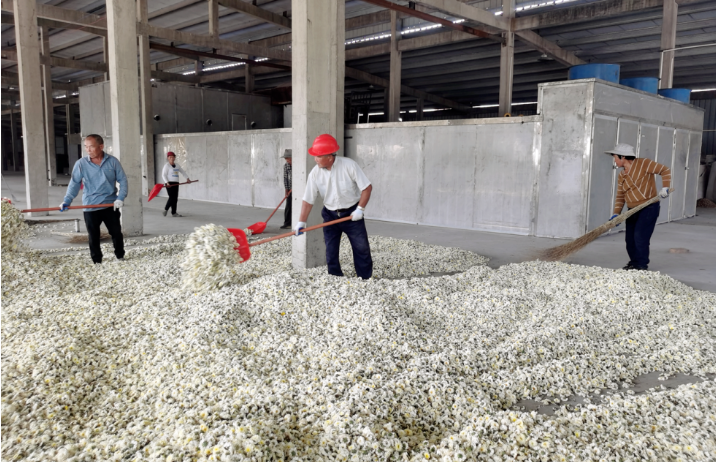 為了延伸菊花產業(yè)鏈,老葉村配套建設了菊花深加工車間,將剛采摘下來的菊花經過殺青、烘干、分揀、裝箱等工序后進行銷售,進一步提高菊花的產值。