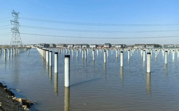 近日,隨著泰興市曲霞16MW魚塘水面光伏發(fā)電項(xiàng)目施工的進(jìn)行,項(xiàng)目初見雛形。未來,這里會(huì)形成水域上空安裝光伏板進(jìn)行發(fā)電,水下進(jìn)行漁業(yè)養(yǎng)殖,實(shí)現(xiàn)資源立體化利用。