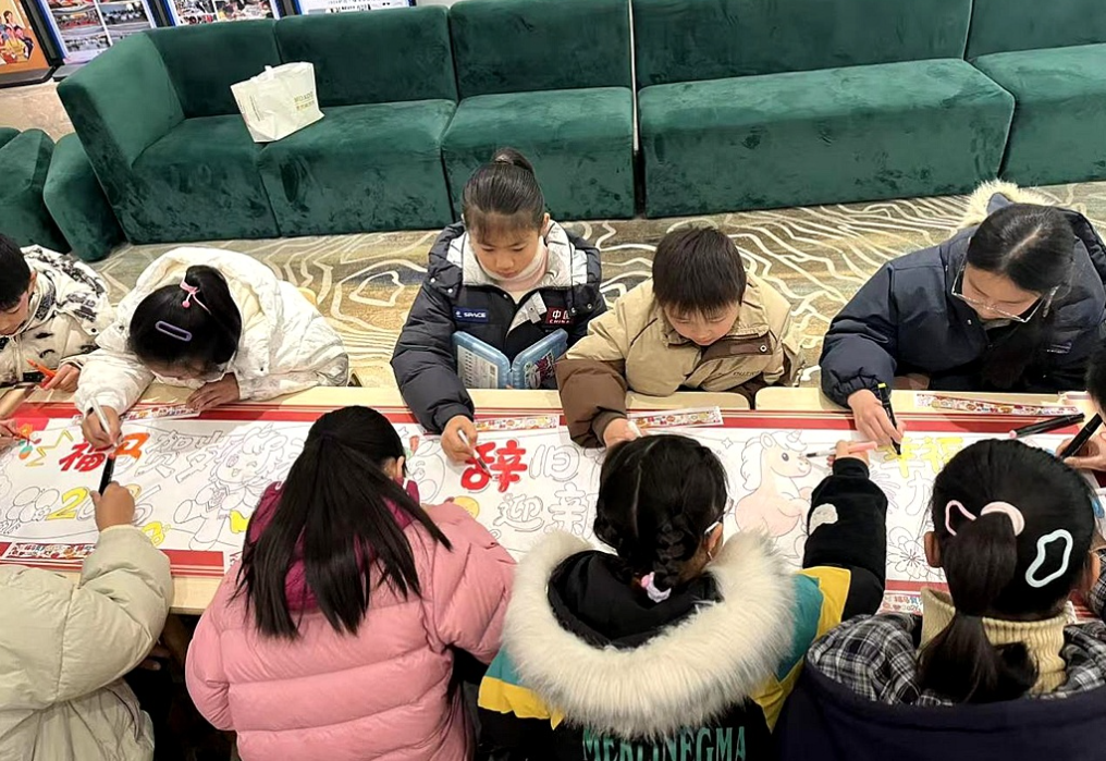 長卷共繪新年愿,筆墨凝聚鄰里情 “文繪元旦長卷”環(huán)節(jié)同樣精彩,社區(qū)文化志愿者張惠帶領大家共同品讀經典文學片段,隨后引導親子家庭把閱讀感悟和新年愿景,用文字和畫筆呈現在長卷之上。孩子們端端正正寫下名言佳句,家長們則細心描繪社區(qū)里的幸福生活場景——熱鬧的文化廣場、整潔的居民樓道、溫馨的鄰里互動……一筆一劃間,一幅融合文字與繪畫的長卷漸漸成形,不僅展現了孩子們的童真童趣,更凝聚著居民對書香社區(qū)、美好生活的共同向往。這場創(chuàng)意滿滿的創(chuàng)作,不僅是一次藝術體驗,更是深化文明共建、拉近鄰里距離的生動實踐。