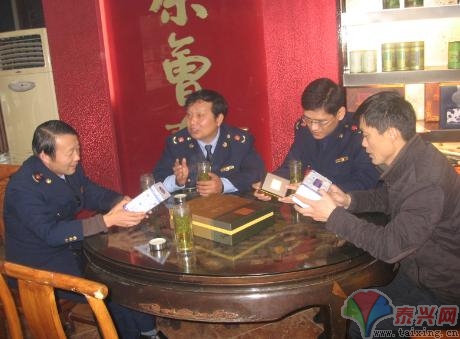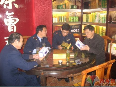 圖為工商執(zhí)法人員與個(gè)私茶社老板講解茶葉知識(shí),引導(dǎo)他們從源頭把好進(jìn)貨關(guān),杜絕劣次茶葉進(jìn)入泰興春節(jié)市場(chǎng),同時(shí)希望個(gè)私業(yè)主如何做大做強(qiáng),做好做優(yōu),創(chuàng)大牌創(chuàng)名牌。 |
