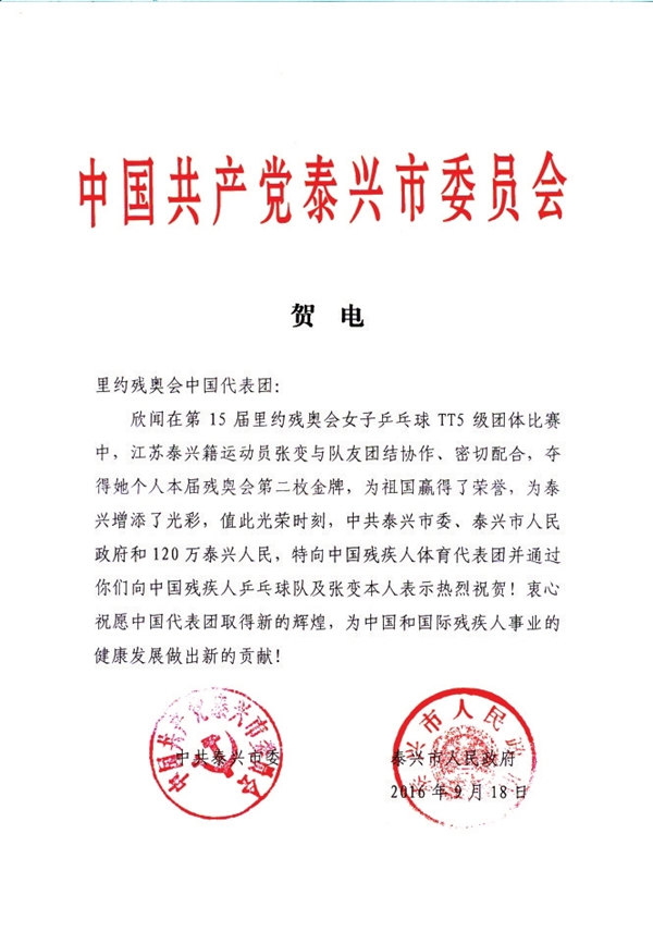 ![]() 結束比賽后,剛回到住處的張變在線再次接受了本報記者的采訪。這個樂觀、上進、開朗的姑娘高興地告訴記者,能摘得團體賽的冠軍,她非常高興。比賽結束接受央視記者采訪時,她更是坦言將利用未來兩年比賽空檔期,回家準備生孩子,兩年后備戰(zhàn)東京奧運會。 回憶剛經歷的團體比賽,張變說,比賽的過程還是挺緊張的。“我和顧改是十來年的隊友了,我們有很高的默契度,配合得非常好。但是在比賽中,我們還是捏了一把汗。”張變說,團體賽中,她們遭遇的塞爾維亞隊選手以前從未交手過,并且對方也代表了他們領域里的最高水平,因此她們比較緊張。 做最壞的打算,盡最大的努力。張變說:“上場前,我和顧改說,最差也就是輸?shù)舯荣,沒有什么。”雖然有最壞的打算,但張變和隊友還是做了最充分的賽前準備,包括各種訓練和比賽戰(zhàn)術等。 “第一場打得特別艱苦,前面我們的比分一度落后。”張變說,隨著比賽的持續(xù)深入,她和隊友漸入佳境,靠著相互鼓勵和相互信任,她們贏了第一局,到第二局的時候就更加順利了。 成功拿下雙打后,單打時,張變鼓勵自己能打什么樣就什么樣,放開了打,思想和行動上都制定了成熟的戰(zhàn)術。最終她們以2:0的成績,成功拿下團體賽冠軍。據(jù)了解,這也是張變繼北京殘奧會、倫敦殘奧會以來,收獲的第三塊女子乒乓球團體賽金牌。 成功的背后是汗水和傷痛。張變說自己和其他運動員一樣,也飽受傷痛的困擾。“從2012年以來,身上一直有各種傷痛,反反復復發(fā)作。”在治療上,張變選擇了物理治療,沒有打封閉,所以一到陰雨天氣,身上的傷痛就會發(fā)作,疼痛難忍,有時候連基本的訓練都難以完成。但在巴西還好,當?shù)貧夂驔]有讓傷痛發(fā)作,使張變和隊友們得以順利完成比賽。 即將結束里約殘奧會全部行程的張變24日即將回到泰興,她說自己想早點回到家,早點和泰興的親人、朋友、泰興殘聯(lián),以及所有關心支持她的人分享成功的喜悅。 市殘聯(lián)理事長秦娟表示:“張變再次奪得殘奧會團體賽冠軍的消息傳到泰興后,我們全市的殘疾人朋友都歡欣鼓舞,大家都表示要學習張變,以更加昂揚的斗志在各自工作領域取得更好成績。” |