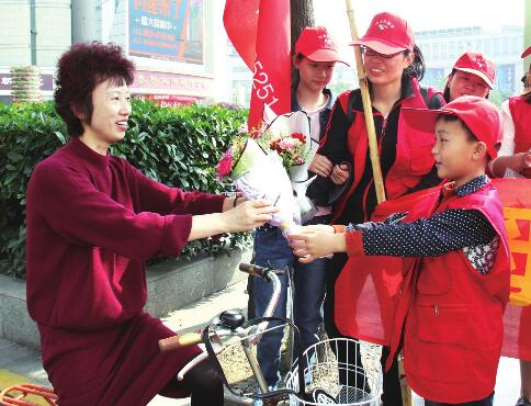 5月14日是母親節(jié),濟川街道躍進(jìn)社區(qū)組織生態(tài)泰興服務(wù)中心志愿者義賣鮮花,將所得款項捐贈給市聾兒語訓(xùn)康復(fù)中心。