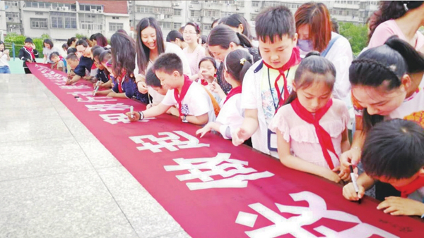 6月14日上午,市襟江小學(xué)舉行“小手拉大手,共建衛(wèi)生城”主題宣傳啟動(dòng)儀式;顒(dòng)中,學(xué)生代表宣讀創(chuàng)衛(wèi)倡議書,家長代表和學(xué)生代表在“從我做起,積極行動(dòng),攜手共創(chuàng)國家衛(wèi)生城市”橫幅上簽字。該校校長黃敬統(tǒng)說:“讓小學(xué)生參與這項(xiàng)活動(dòng),首先幫著爸爸媽媽搞好家庭衛(wèi)生,同時(shí)要搞好社區(qū)的衛(wèi)生,還要宣傳健康生活的理念,將創(chuàng)衛(wèi)工作通過我們小朋友的宣傳行動(dòng)推向一個(gè)新高度。”記者 王姝文 攝