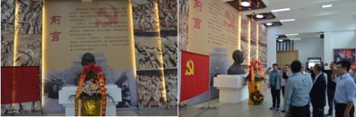 在紀(jì)念館瞻仰廳,全體人員瞻仰了泰興縣委第一任書記沈毅烈士銅像。沈毅為泰州人,1925年,25歲的他來到刁家網(wǎng),在刁家網(wǎng)地區(qū)點(diǎn)燃革命星火。從此,“要找共產(chǎn)黨,就到刁家網(wǎng)”在人民群眾中廣為流傳。1928年,28歲的沈毅沒有逃脫敵人的追捕,光榮就義,永遠(yuǎn)地離開了刁家網(wǎng),但是他留下的革命火種卻一直在燃燒。此后,歷經(jīng)土地革命、抗日戰(zhàn)爭和解放戰(zhàn)爭,中共泰興縣委先后有力地支援了黃橋決戰(zhàn)和以黃橋?yàn)橹行牡奶K中抗日民主根據(jù)地建設(shè),配合華中野戰(zhàn)軍取得了彪炳軍史的蘇中七戰(zhàn)七捷,最終獲得了泰興全境解放。