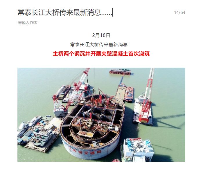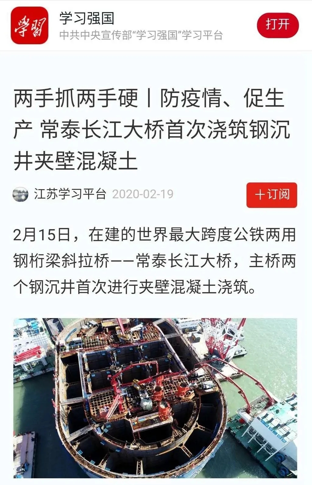 (記者 張宏偉 李鑫 李帥 趙望)2月18日,泰興市融媒體中心以全媒體形態(tài),發(fā)布了常泰長江大橋抓好疫情防控,實施主橋鋼沉井首次澆筑的消息。 點擊圖片查看原文鏈接 該消息發(fā)布后,迅速被中央電視臺《朝聞天下》、《新聞30分》,《學習強國》,《經濟日報》等中央媒體轉載轉發(fā)。