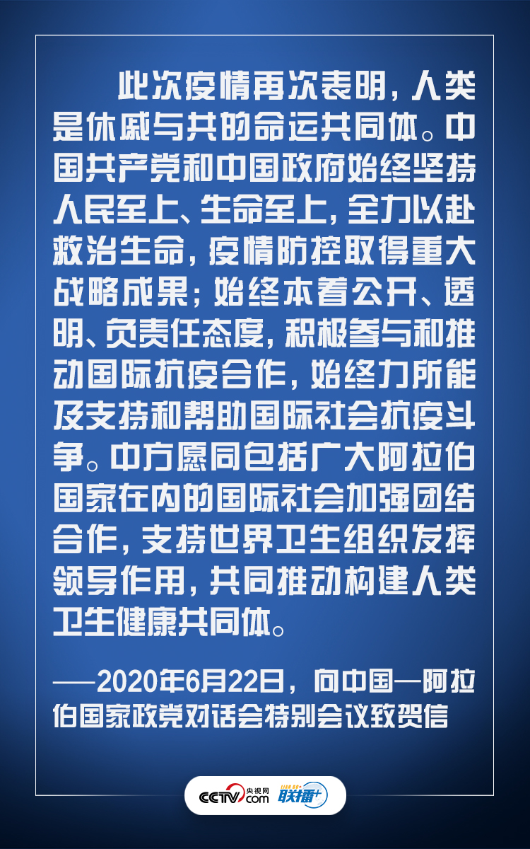 聯(lián)播+ 6月22日,中國—阿拉伯國家政黨對(duì)話會(huì)特別會(huì)議以視頻會(huì)議方式召開,習(xí)近平主席向會(huì)議致賀信。 習(xí)近平指出,中阿友誼源遠(yuǎn)流長,歷久彌新。中阿兩大民族在古絲綢之路上出入相友,在共建“一帶一路”中攜手相伴,共同致力于實(shí)現(xiàn)國家富強(qiáng)、民族復(fù)興夢(mèng)想。面對(duì)突如其來的新冠肺炎疫情,中阿守望相助、共克時(shí)艱,譜寫了共建中阿命運(yùn)共同體的新篇章。 新冠肺炎疫情發(fā)生以來,習(xí)近平主席始終秉持人類命運(yùn)共同體理念,以元首外交統(tǒng)領(lǐng)抗疫外交,以領(lǐng)袖擔(dān)當(dāng)推動(dòng)國際合作,開啟了以電話、書信、視頻為主渠道的“云外交”模式。 “我贊賞你提出的人類命運(yùn)共同體理念,贊同支持世衛(wèi)組織為國際抗疫合作發(fā)揮領(lǐng)導(dǎo)作用。”“塔方愿同中方一道,攜手推動(dòng)構(gòu)建人類命運(yùn)共同體。”“我完全贊同習(xí)近平主席所說,這次疫情表明構(gòu)建人類命運(yùn)共同體十分重要。”……在全球攜手抗疫的過程中,“人類命運(yùn)共同體”理念得到了國際社會(huì)的高度認(rèn)可。 央視網(wǎng)《聯(lián)播+》欄目特梳理習(xí)近平主席的深入闡述,與您一起學(xué)習(xí)感悟這一重要理念。