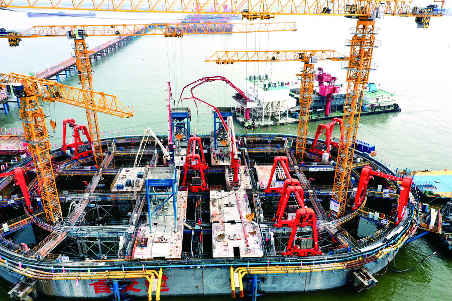 (記者 周冰 通訊員 凌鴻茹)春節(jié)期間,在常泰長江大橋5號墩沉井施工現(xiàn)場,一臺臺混凝土攪拌車排成長龍,通過傳送泵向五號墩輸送著混凝土。在墩沉井附近,幾艘浮吊船正?吭谂裕粩鄵]舞著“手臂”進行作業(yè),工人師傅們按照現(xiàn)場技術(shù)專家的要求進行面層澆筑、構(gòu)件架設(shè)等工序施工,整個現(xiàn)場焊花飛舞、機聲隆隆,一片繁忙的景象。