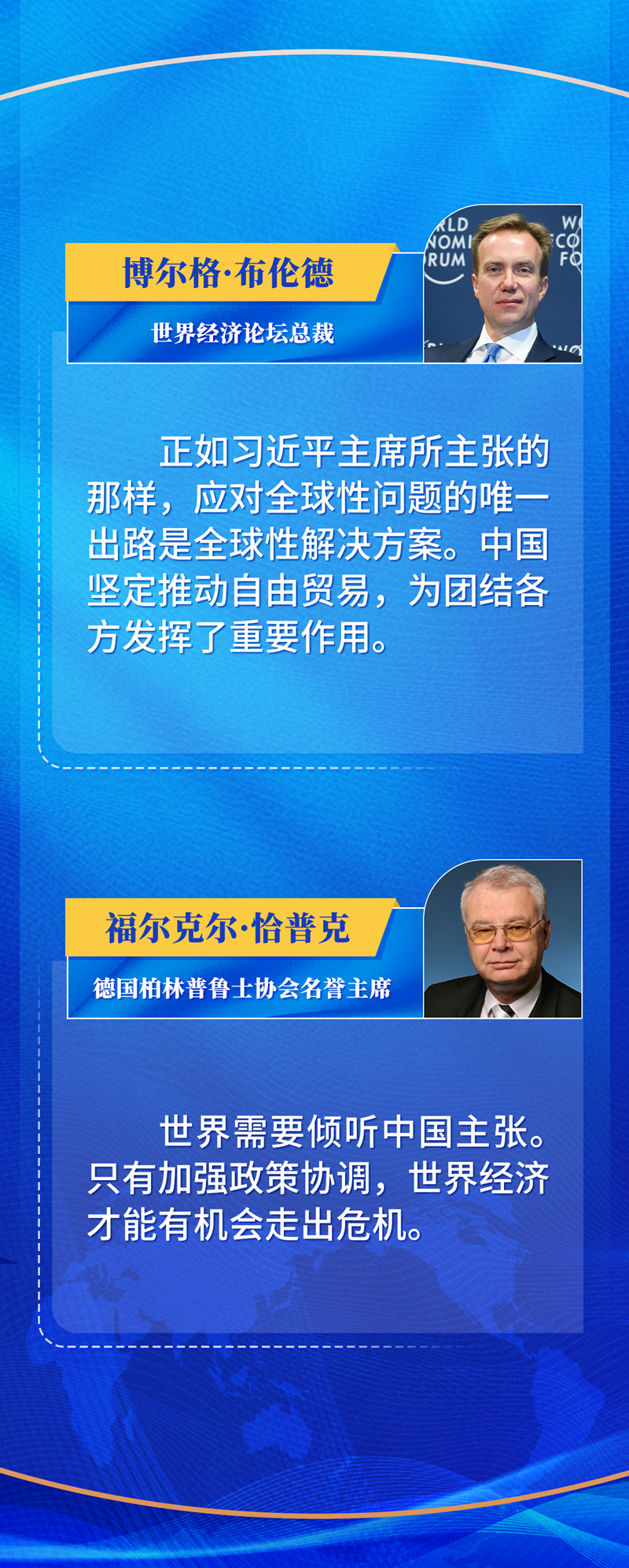 2023年剛開年,世界銀行發(fā)布新一期《全球經(jīng)濟(jì)展望》報告,認(rèn)為全球經(jīng)濟(jì)正“危險地接近陷入衰退的程度”。 放眼當(dāng)今世界,多國滯脹的風(fēng)險、多地沖突的硝煙、氣候變化的危害、大國金融政策的負(fù)面外溢……全球焦點(diǎn)、熱點(diǎn)、難點(diǎn)問題層出不窮,貧窮、分裂、動蕩有增無減。 怎么看?“當(dāng)今世界正在經(jīng)歷百年未有之大變局。這場變局不限于一時一事、一國一域,而是深刻而宏闊的時代之變。”——習(xí)近平主席洞悉時代之變,一語點(diǎn)明當(dāng)今世界大勢的根本特征。 怎么辦?“世界上的問題錯綜復(fù)雜,解決問題的出路是維護(hù)和踐行多邊主義,推動構(gòu)建人類命運(yùn)共同體。”——習(xí)近平主席把握歷史規(guī)律,展現(xiàn)信心勇氣,為世界共迎挑戰(zhàn)指明方向。 縱觀歷史,人類社會正是在戰(zhàn)勝一次次考驗(yàn)中成長、在克服一場場危機(jī)中發(fā)展。只要在歷史前進(jìn)的邏輯中前進(jìn)、在時代發(fā)展的潮流中發(fā)展,我們就能在危機(jī)中育新機(jī)、于變局中開新局,共同匯聚起戰(zhàn)勝困難的強(qiáng)大力量。 從“充分利用一切機(jī)遇,合作應(yīng)對一切挑戰(zhàn)”,到“人類只有一個地球,人類也只有一個共同的未來”,到“各國不是乘坐在190多條小船上,而是乘坐在一條命運(yùn)與共的大船上”……習(xí)近平主席在達(dá)沃斯論壇上生動真誠的話語,傳遞出一個鮮明主張:“團(tuán)結(jié)就是力量,分裂沒有出路。” 今年的達(dá)沃斯論壇年會以“在分裂的世界中加強(qiáng)合作”為主題。對習(xí)近平主席的主張,世界經(jīng)濟(jì)論壇總裁博爾格·布倫德深表認(rèn)同。他說,應(yīng)對全球性問題的出路是全球性解決方案。“中國堅(jiān)定推動自由貿(mào)易,為團(tuán)結(jié)各方發(fā)揮了重要作用。”