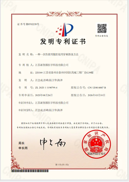 • 3月10日藥城控股集團(tuán)旗下新智源公司的一種一次性使用腹腔鏡用穿刺器及方法獲得國家知識(shí)產(chǎn)權(quán)局正式授權(quán)標(biāo)志著國家知識(shí)產(chǎn)權(quán)局對(duì)該技術(shù)創(chuàng)新性、實(shí)用性與臨床價(jià)值的高度認(rèn)可此次獲授權(quán)的發(fā)明專利(專利號(hào):ZL202511198799 4,授權(quán)公告號(hào):CN120814887B)——一[詳細(xì)]